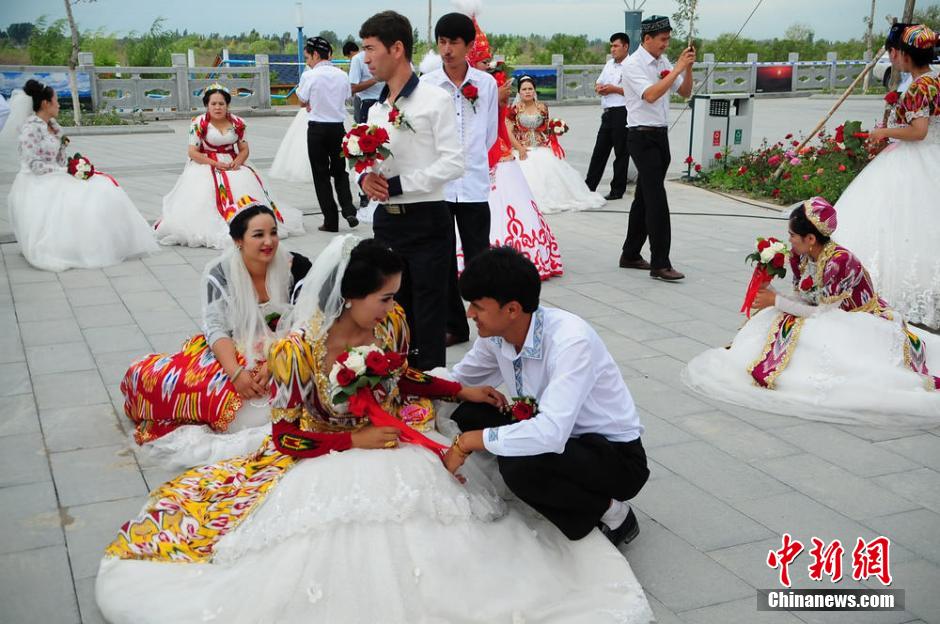 A group wedding is held for 60 couples in Yining, Kazak Autonomous Prefecture of Ili, Xinjiang Uyghur Autonomous Region on Aug. 18, 2014. The day marks the 60th anniversary of the founding of the prefecture. (Chinanews/Ma Xinlong)