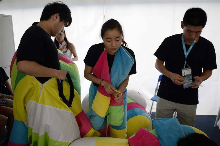 The volunteers wear the heavy costumes on Aug. 17, 2014. (Xinhua/Ju Huanzong)