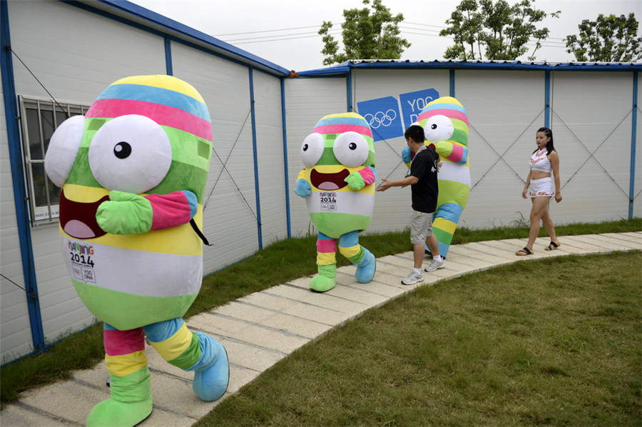 The “mascots” go to the completion venue on Aug. 17, 2014. (Xinhua/Ju Huanzong)
