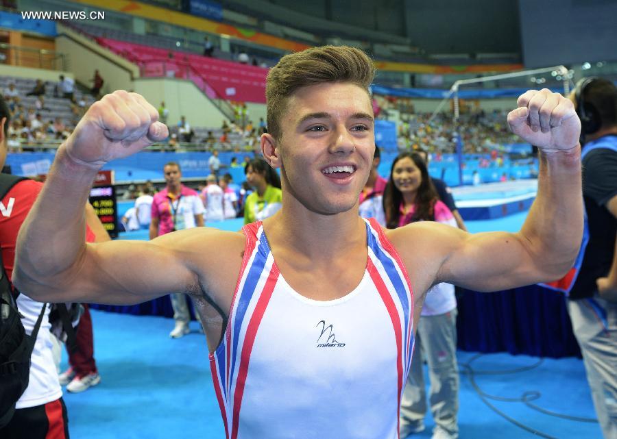Gold medalist Giarnni Regini-Moran of Great Britain celebrates after the men's all-around final of artistic gymnastics at the 2nd Summer Youth Olympic Games (YOG) in Nanjing, capital of east China's Jiangsu Province, August 19, 2014. (Xinhua/Cheng Min)