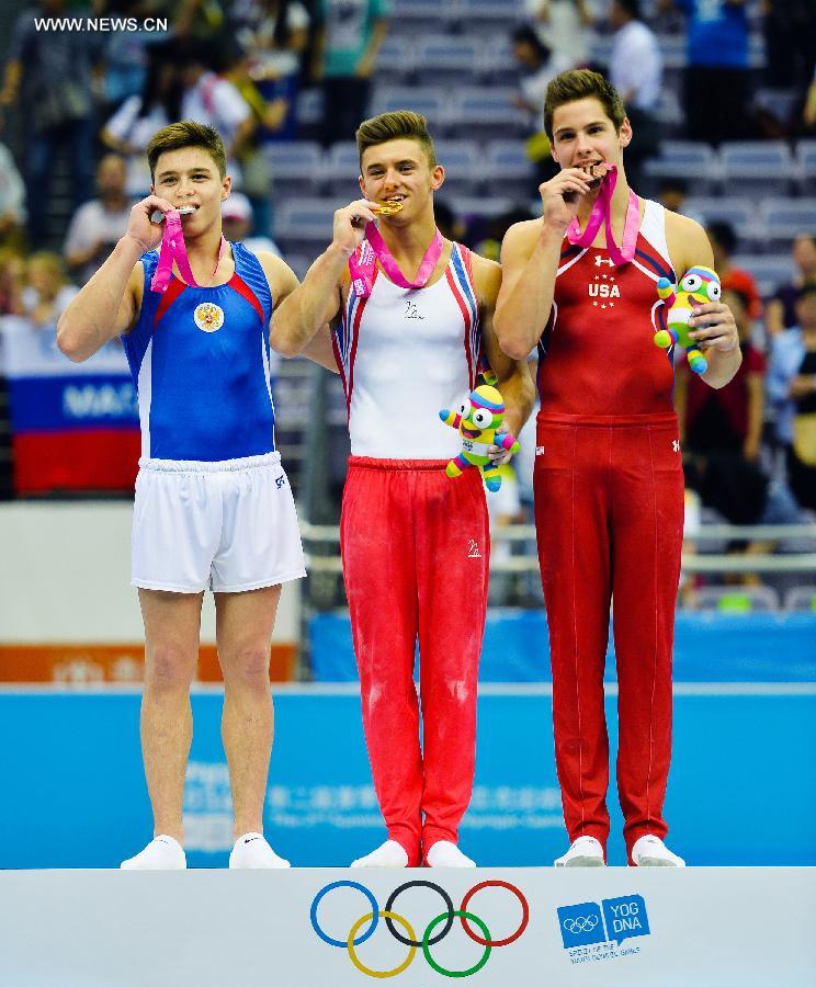 Gold medalist Giarnni Regini-Moran of Great Britain celebrates after the men's all-around final of artistic gymnastics at the 2nd Summer Youth Olympic Games (YOG) in Nanjing, capital of east China's Jiangsu Province, August 19, 2014. (Xinhua/Cheng Min) |