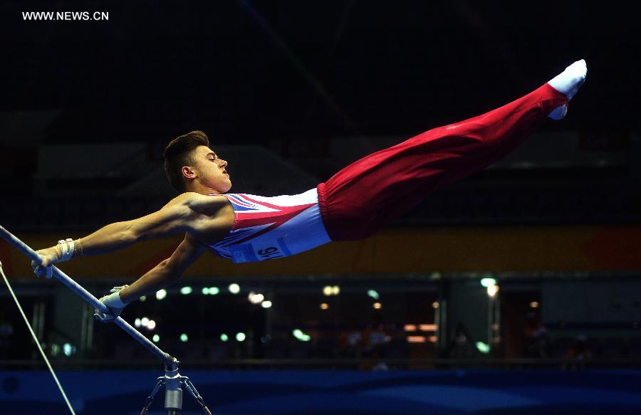Gold medalist Giarnni Regini-Moran of Great Britain competes in the men's all-around final of artistic gymnastics at the 2nd Summer Youth Olympic Games (YOG) in Nanjing, capital of east China's Jiangsu Province, August 19, 2014. (Xinhua/Cheng Min)