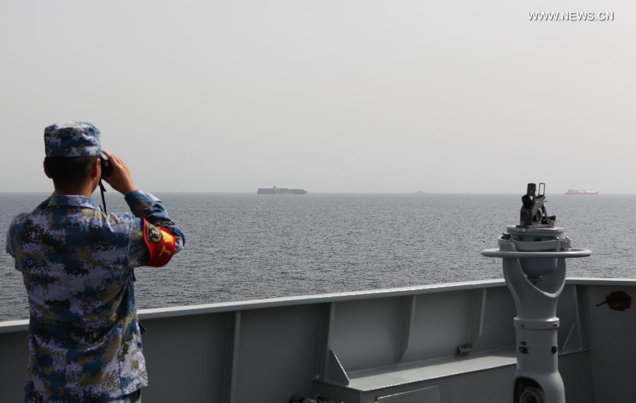 A Chinese Navy soldier observes from China's amphibious landing ship Changbaishan during an escort mission in the Gulf of Aden, Aug. 19, 2014. This is the 18th convoy fleet sent by the Chinese People's Liberation Army Navy for these missions since 2008. (Xinhua/Zhang Yuelin) |