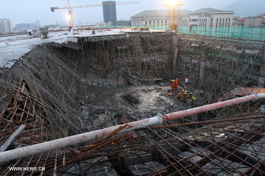 Rescuers work at the accident site after a building collapsed in Xiamen City, southeast China's Fujian Province, Aug. 20, 2014. The top floor of a shopping mall under construction partially collapsed early Wednesday, and all the three trapped workers have been rescued. (Xinhua/Zeng Demeng)