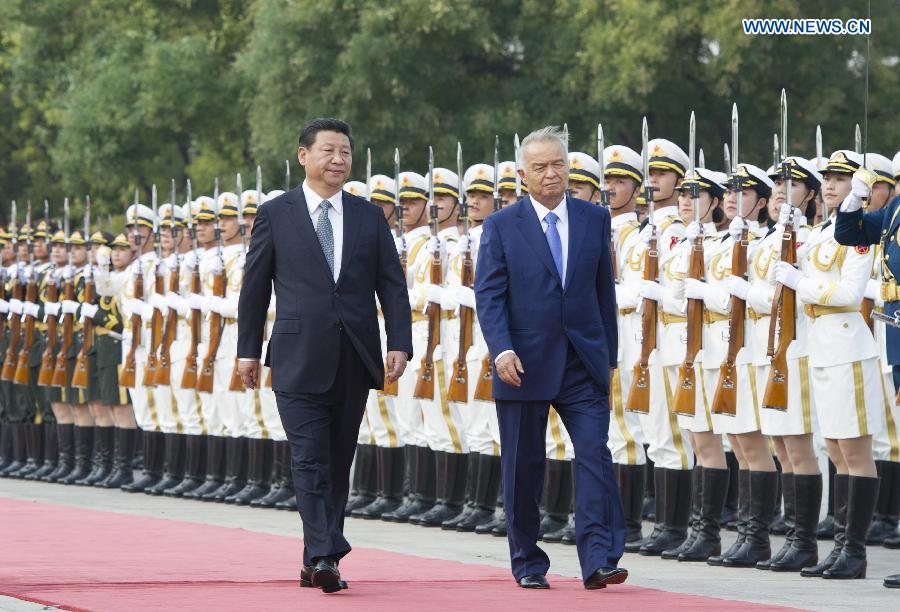 Chinese President Xi Jinping (L) and Uzbekistan's President Islam Karimov review the guard of honour during a welcoming ceremony prior to their talks in Beijing, capital of China, Aug. 19, 2014. (Xinhua/Huang Jingwen)