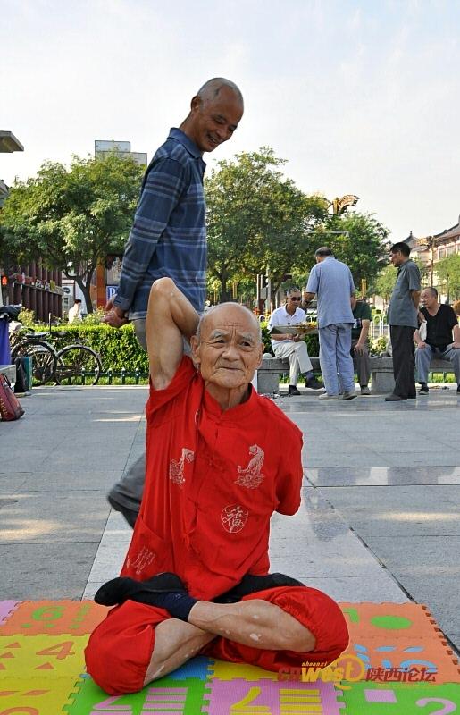 Yang Shiguang, 78, is a member of the "Unique skills team of Xi'an". He started to practice handstand, Rougong (a Chinese Kong fu) and Yoga at the age of 70, and now he is very famous for his stunning skills. (Photo/cnwest)