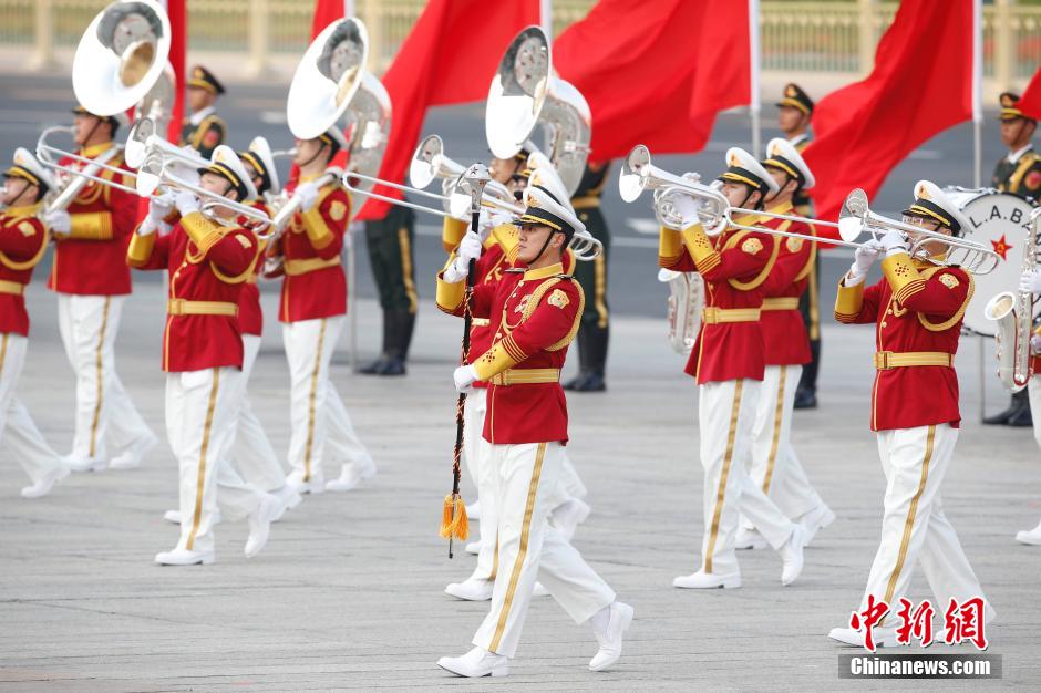 The military band of the PLA performs at the welcome ceremony attended by President Xi Jinping and visiting Uzbek President Islam Karimov on Aug. 19, 2014. (CNS/Du Yang)