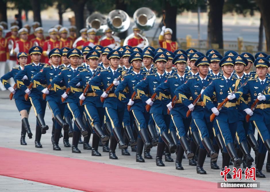 The Guard of Honor of the People's Liberation Army wearing the new type of uniform is reviewed at the welcome ceremony on Aug. 19, 2014. (CNS/Du Yang)