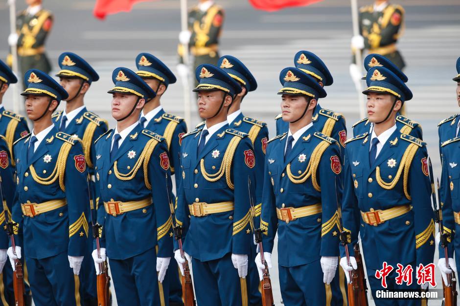 The Guard of Honor of the People's Liberation Army wearing the new type of uniform is reviewed at the welcome ceremony on Aug. 19, 2014. (CNS/Du Yang)