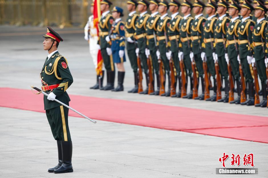 The Guard of Honor of the People's Liberation Army wearing the new type of uniform is reviewed at the welcome ceremony on Aug. 19, 2014. (CNS/Du Yang)