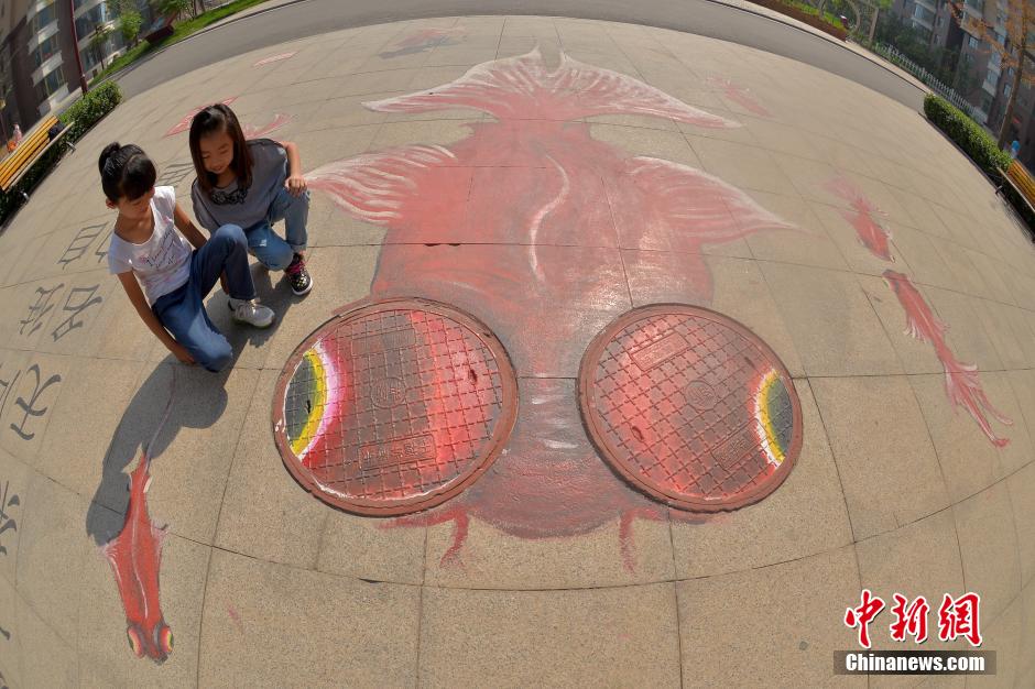 More than 30 graffiti are painted on manhole covers in a neighborhood in Shanxi on Aug. 18, 2014. The graffiti are creative and feast the public eyes. (CNS/Wu Junjie)