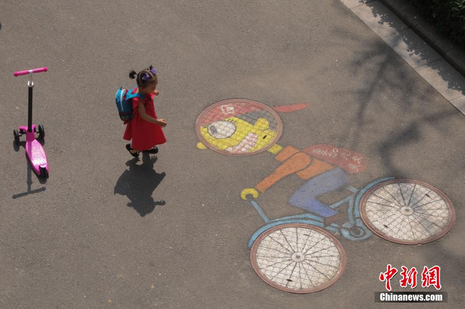 The graffito depicts a kid riding a bike. More than 30 graffiti are painted on manhole covers in a neighborhood in Shanxi on Aug. 18, 2014. The graffiti are creative and feast the public eyes. (CNS/Wu Junjie)