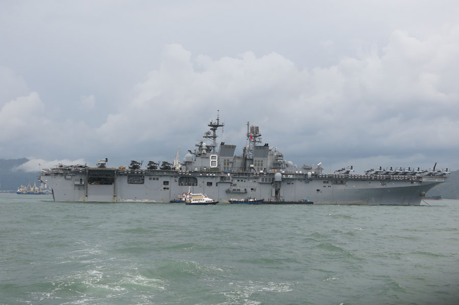 The amphibious assault ship USS Makin Island (LHD 8) arrives in Hong Kong for a port visit on Aug. 20, 2014. [Photo: CRIENGLISH.com]