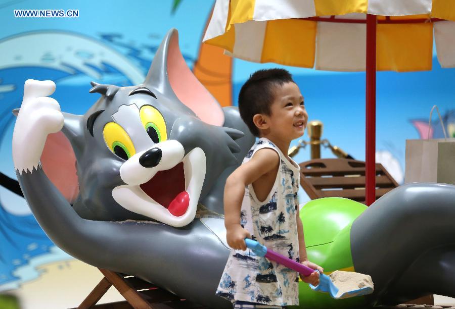 A child plays before a model of Metro-Goldwyn-Mayer cartoon character Tom at a shopping mall in Shenyang, capital of northeast China's Liaoning Province, Aug. 22, 2014. (Xinhua/Yao Jianfeng)