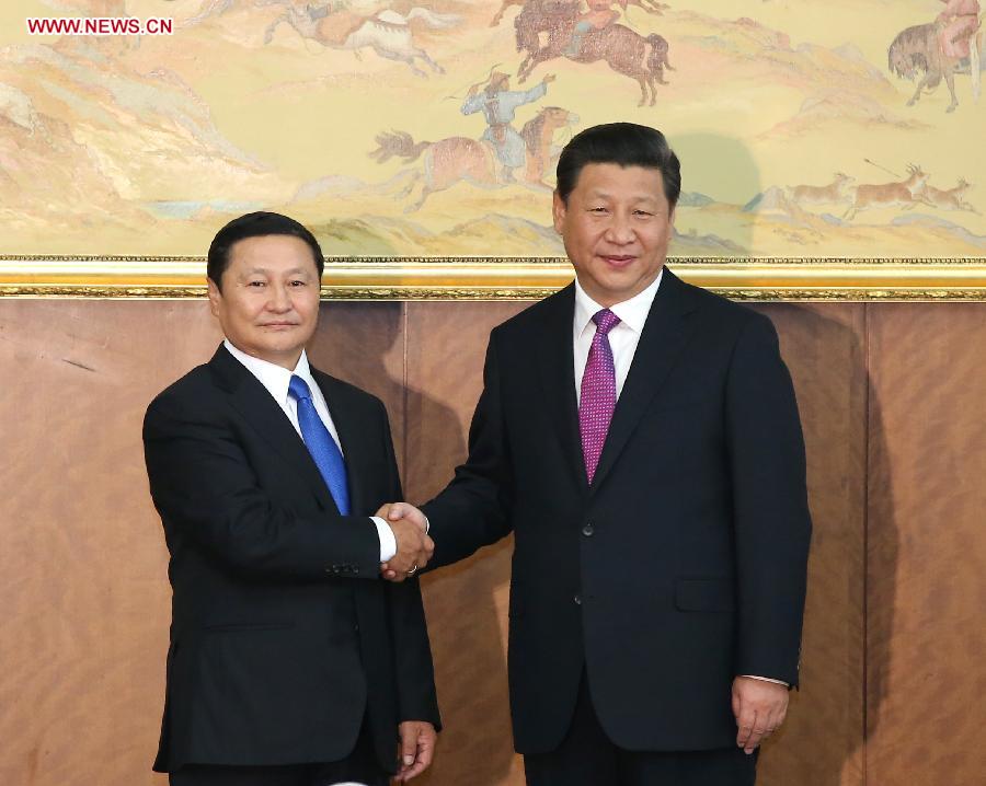 Chinese President Xi Jinping (R) meets with Mongolia's Prime Minister Norov Altankhuyag in Ulan Bator, Mongolia, Aug. 22, 2014. (Xinhua/Pang Xinglei)