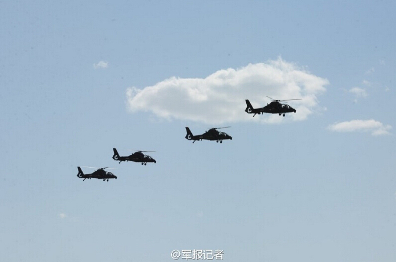 China′s Z-19 and Z-10 military helicopters debut in the “Peace Mission-2014” joint anti-terrorism military exercise held by the armed forces of the Shanghai Cooperation Organization (SCO) member states in an airport in north China on August 20, 2014. (GMW/Qian Xiaohu and Zhou Ming)