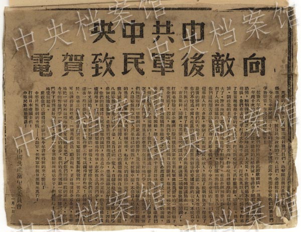 The Central Committee of the CPC sent a New Year’s message to the people and armed forces in the enemy’s rear areas on January 1, 1944. (Photo/China's State Archives Administration)