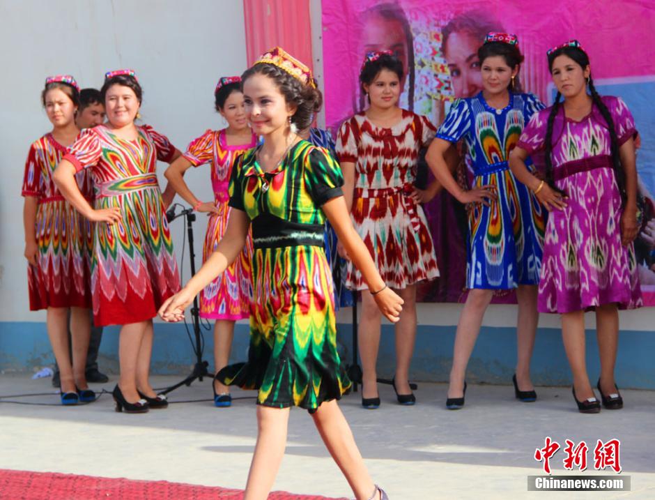 Farmers and herdsmen display ethnic costumes in Yaha town of Kuqa county, Xinjiang on Aug. 20, 2014. (Chinanews/Fan Hongying)