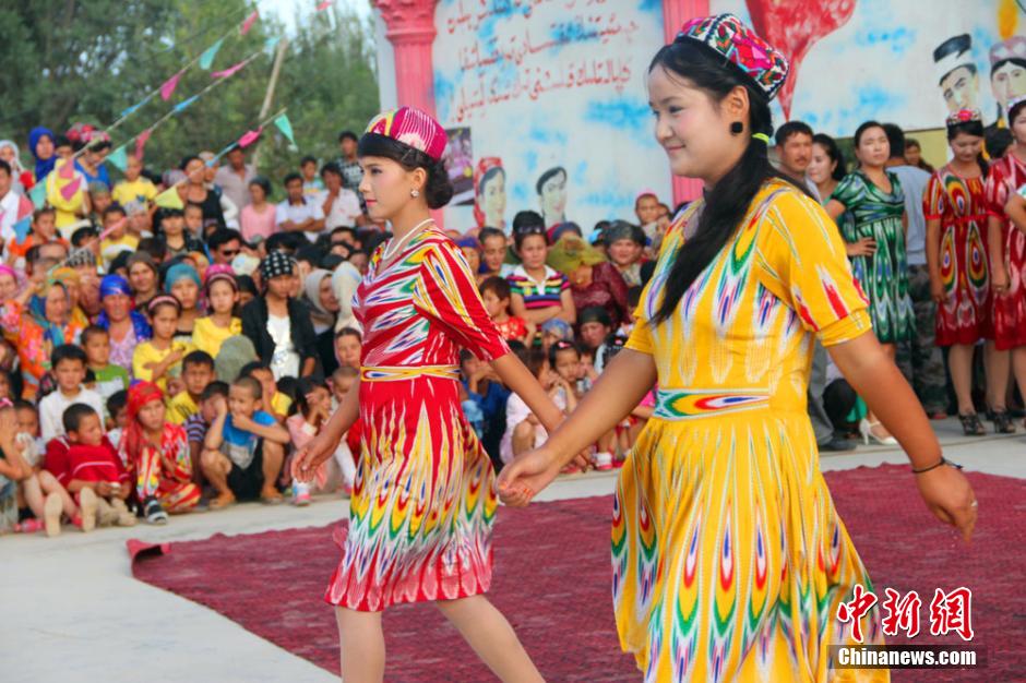 Farmers and herdsmen display ethnic costumes in Yaha town of Kuqa county, Xinjiang on Aug. 20, 2014. (Chinanews/Fan Hongying)