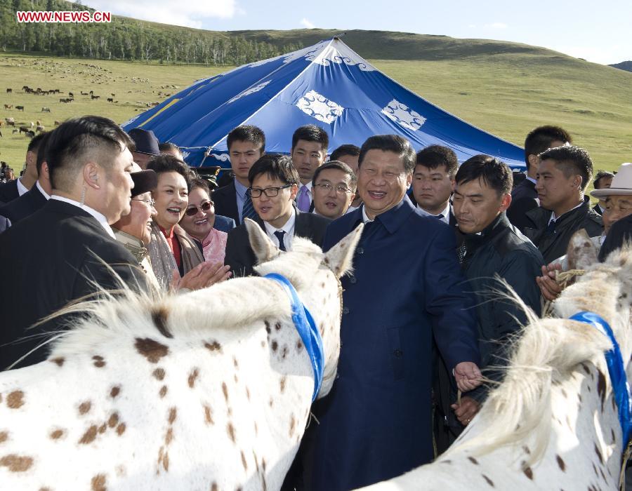 Mongolian President Tsakhiagiin Elbegdorj presents two Mongolian horses to Chinese President Xi Jinping and his wife while they watch "Nadam Fair ", a traditional Mongolian pageant for entertainment and games, in Ulan Bator, Mongolia, Aug. 22, 2014. (Xinhua/Huang Jingwen) |