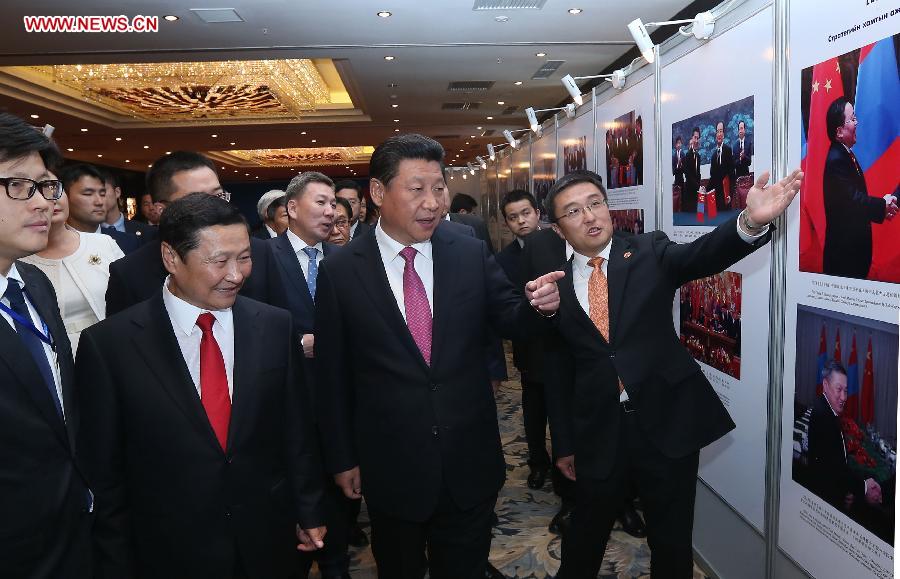 Chinese President Xi Jinping and Mongolia's Prime Minister Norov Altankhuyag attend the opening ceremony of an exhibition about the past economic and trade cooperation between China and Mongolia in Ulan Bator, Mongolia, Aug. 22, 2014. (Xinhua/Pang Xinglei) |