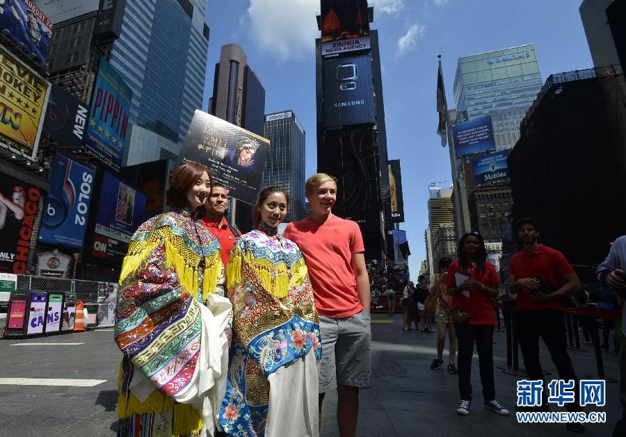 Peking opera actresses, dressed in opera costumes, communicates with people on the street about Peking opera. (Xinhuanet/Wang Lei)