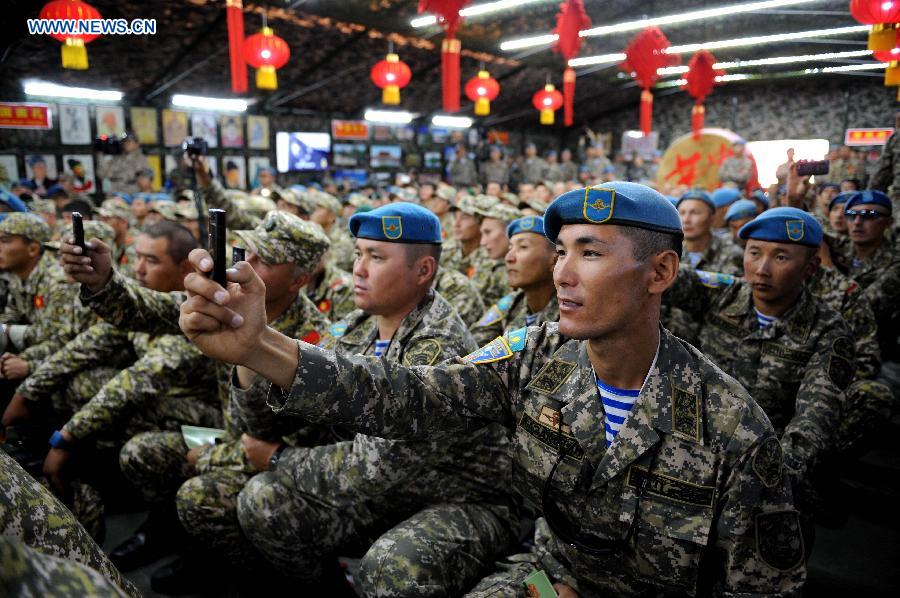 Soldiers from Kazakhstan watch the performance of traditional Chinese art ahead of the Peace Mission-2014 anti-terror drill at the Zhurihe training base, north China's Inner Mongolia Autonomous Region, Aug. 23, 2014. The drill will be held from Aug. 24 to Aug. 29 among troops from China, Russia, Kazakhstan, Kyrgyzstan and Tajikistan. (Xinhua/Zhang Ling) |