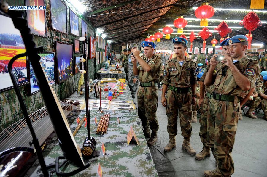 Soldiers from Tajikistan view the traditional Chinese musical instruments ahead of the Peace Mission-2014 anti-terror drill at the Zhurihe training base, north China's Inner Mongolia Autonomous Region, Aug. 23, 2014. The drill will be held from Aug. 24 to Aug. 29 among troops from China, Russia, Kazakhstan, Kyrgyzstan and Tajikistan. (Xinhua/Zhang Ling) |