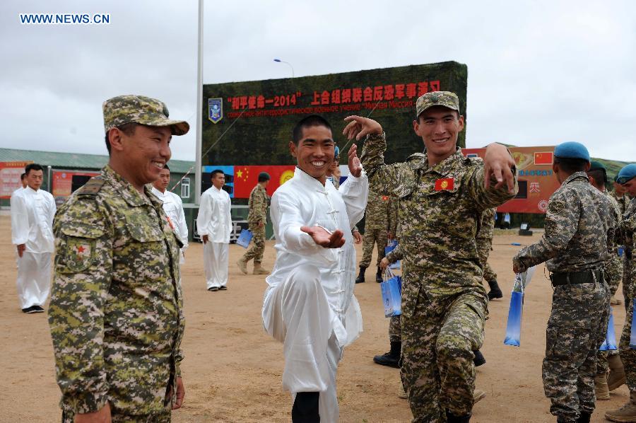 Soldiers from Kyrgyzstan join in the performance of Chinese martial exercise of Tai Chi ahead of the Peace Mission-2014 anti-terror drill at the Zhurihe training base, north China's Inner Mongolia Autonomous Region, Aug. 23, 2014. The drill will be held from Aug. 24 to Aug. 29 among troops from China, Russia, Kazakhstan, Kyrgyzstan and Tajikistan. (Xinhua/Zhang Ling) |