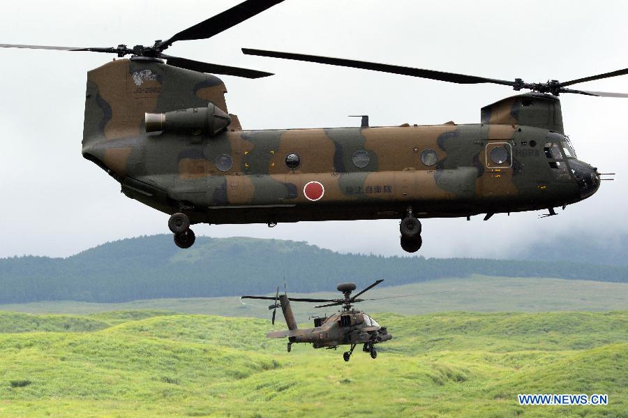 The Japanese Ground Self-Defense Forces (GSDF) attend live-fire drill at foothill of Mt. Fuji, Aug. 24, 2104. The Japanese GSDF on Sunday held an annual live-fire military drill in the GSDF maneuver field at the foothill of Mount Fuji in Gotemba city in Shizuoka Prefecture, with the participation of Defense Minister Itsunori Onodera. (Xinhua/Ma Ping) |
