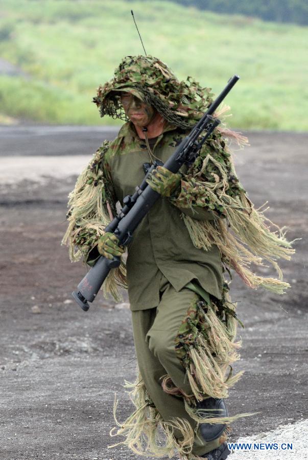 A Japanese Ground Self-Defense Forces (GSDF) soldier takes position during a live-fire drill at foothill of Mt. Fuji, Aug. 24, 2104. The Japanese GSDF on Sunday held an annual live-fire military drill in the GSDF maneuver field at the foothill of Mount Fuji in Gotemba city in Shizuoka Prefecture, with the participation of Defense Minister Itsunori Onodera. (Xinhua/Ma Ping) |