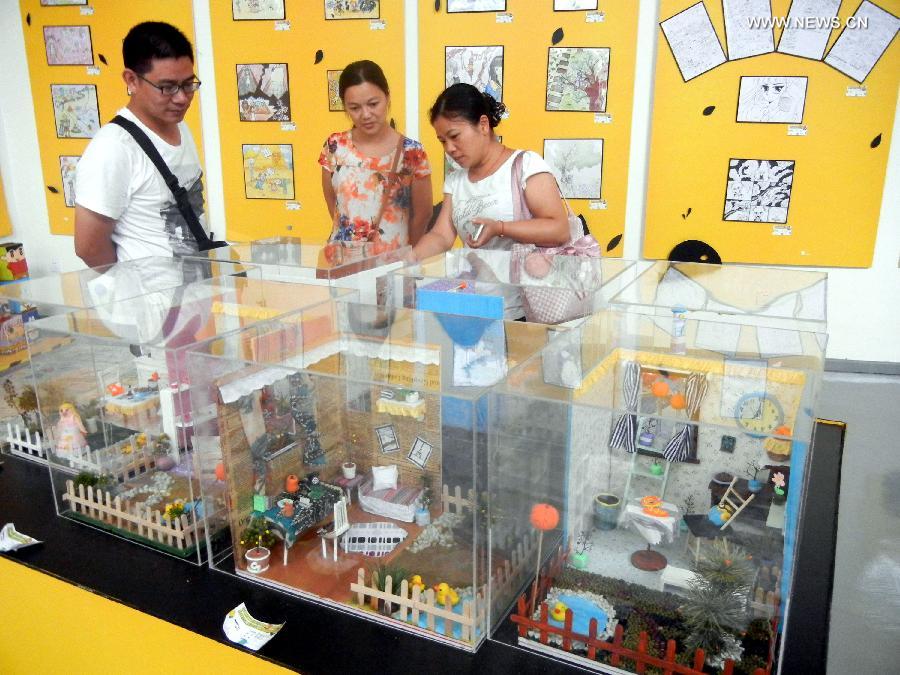 Visitors look at miniature indoor designs during the First Suzhou International Children's Visual Arts Biennial Exhibition in Suzhou, east China's Jiangsu Province, Aug. 24, 2014. Over 1,000 visual artworks done by kids around the world will be shown during the First Suzhou International Children's Visual Arts Biennial Exhibition, which is available from Aug. 23 to Sept. 14 in Suzhou. (Xinhua/Wang Jiankang)