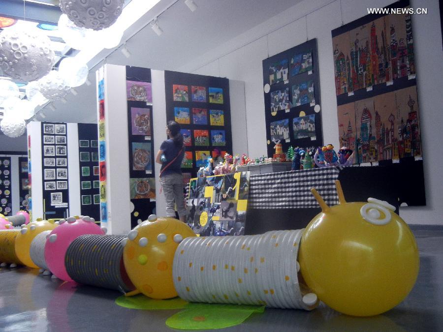 A visitor looks at paintings displayed at the First Suzhou International Children's Visual Arts Biennial Exhibition in Suzhou, east China's Jiangsu Province, Aug. 24, 2014. Over 1,000 visual artworks done by kids around the world will be shown during the First Suzhou International Children's Visual Arts Biennial Exhibition, which is available from Aug. 23 to Sept. 14 in Suzhou. (Xinhua/Wang Jiankang)