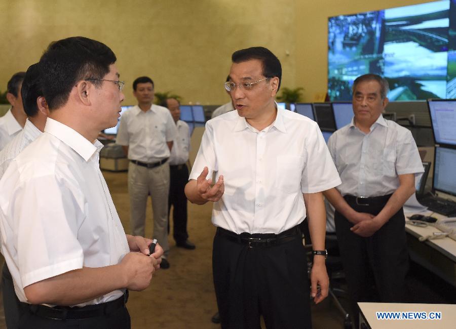 Chinese Premier Li Keqiang (C) talks with staff members at the railway transport command center of the China Railway Corporation (CRC) in Beijing, capital of China, Aug. 22, 2014. Li Keqiang made an inspection tour to the CRC and hosted a symposium at the company on Aug. 22. (Xinhua/Ma Zhancheng) |