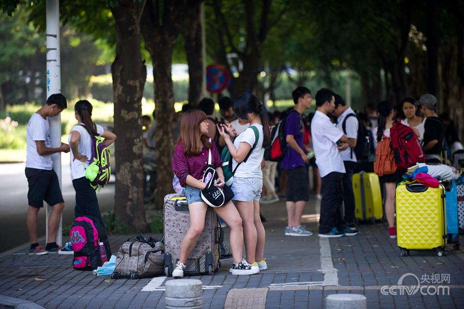 More than a hundred of university students gather in the North Central Avenue in Shenzhen on July 5, 2014, waiting to receive a part of their return fare. They all came from Guangxi Normal University and Guilin University of Technology to find a summer job. Finally they found what the employment agency in Shenzhen had promised was not true. Police got involved in the affair. The employment agency was asked to refund the transport fare to the students. (Photo/CNTV) |