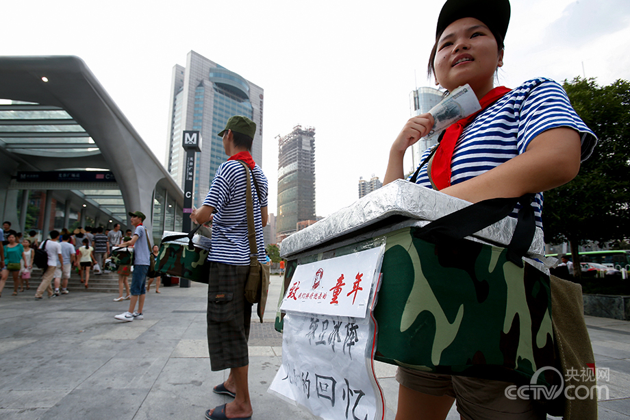 A group of college students in costume sell ice-cream at a subway station in Wuhan of central China's Hubei province on Aug. 1, 2013.(Photo/CNTV)