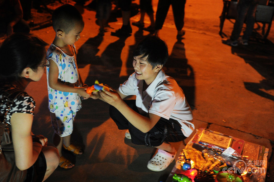 Zhao Qiancheng teaches little children how to play the toys to earn some money on July 14, 2013. Zhao came to Zhengzhou to live with his parents every summer. "My mother only earns 1000 yuan a month, I want to help her," Zhao said.(Photo/CNTV)