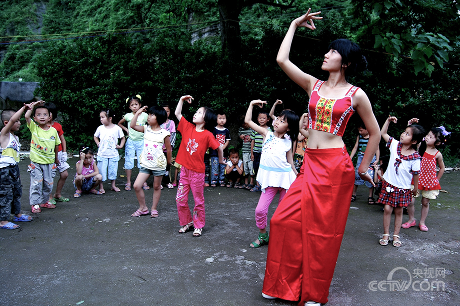Dao Xiwenna, volunteer from Southwest University in Chongqing, teaches the children in Jinshan Primary School to dance on July 23, 2010. (Photo/CNTV)