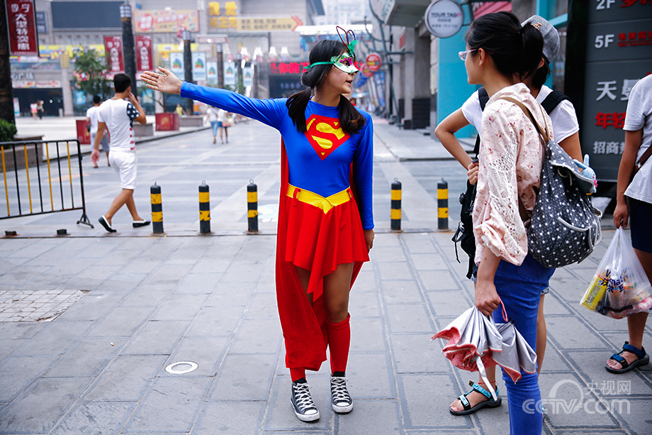 A 'superwoman' provides helps to the tourists in a street of Xi'an on July 24, 2013. The 'superwoman' is a college student who wants to spend her holidays to help people. "The reason that I am dressed as 'superwoman' is to catch the attention of the people who may need my help."(Photo/CNTV) |