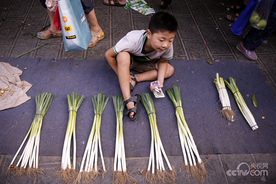 9-year-old Tian Dongyang helps the parents sell green onion at a market in Xi'an on Aug. 17, 2013. Each summer he comes from the hometown to spend holidays with his parents who work in the city. (Photo/CNTV)