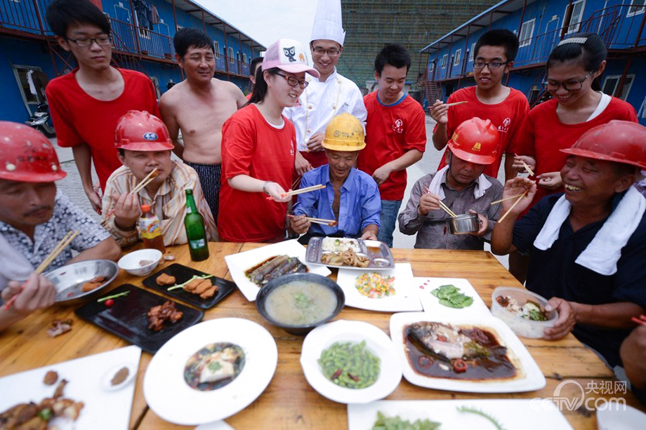 The students from Culinary Institute of Yangzhou University share the food they prepared specially for migrant workers on July 17, 2013 .(Photo/CNTV)