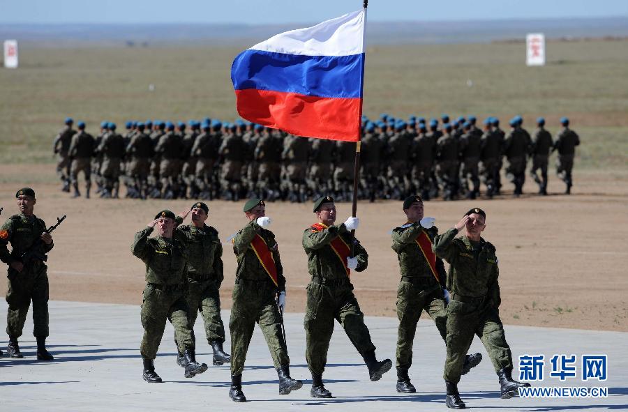 Participating troops from Russia present parade for the opening ceremony of the “Peace Mission -2014” on August 24, 2014. (Xinhua News Agency/Zhang Ling)