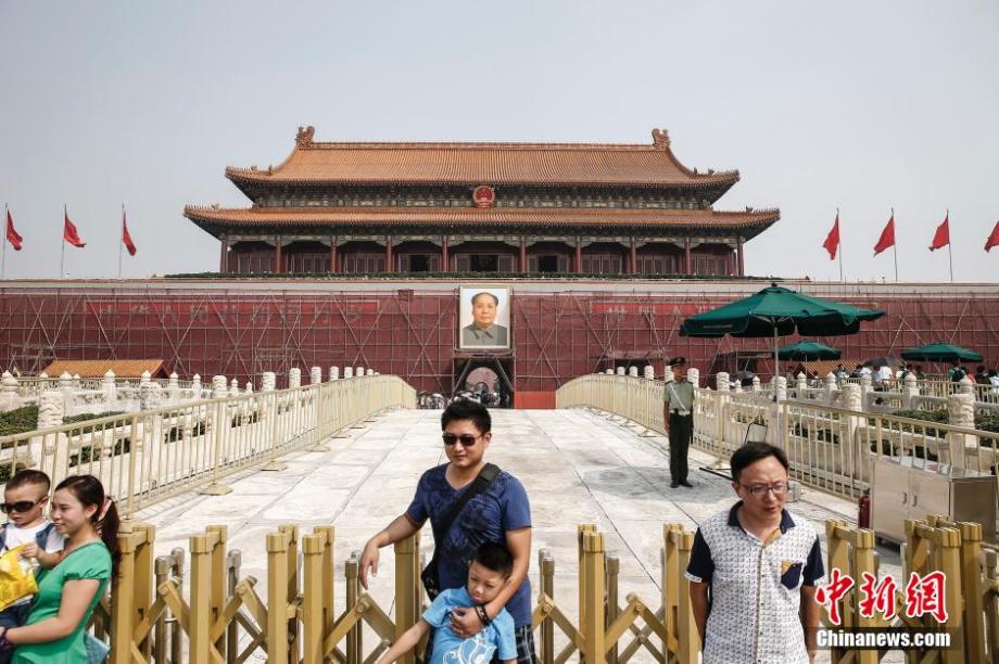 | To embrace the 65th founding anniversary of People's Republic of China, Tiananmen, the famous monument and national symbol in Beijing, is ready for repaint and repairs on Aug. 20, 2014. (Photo/CNS) |