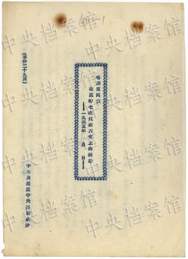 Mao Zedong gave a closing speech at the Seventh National Congress of the CPC on June 11, 1945.(Photo/China's State Archives Administration)