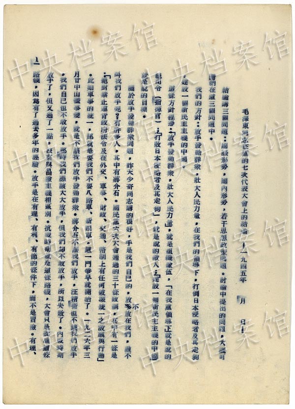 Mao Zedong gave a closing speech at the Seventh National Congress of the CPC on June 11, 1945.(Photo/China's State Archives Administration)
