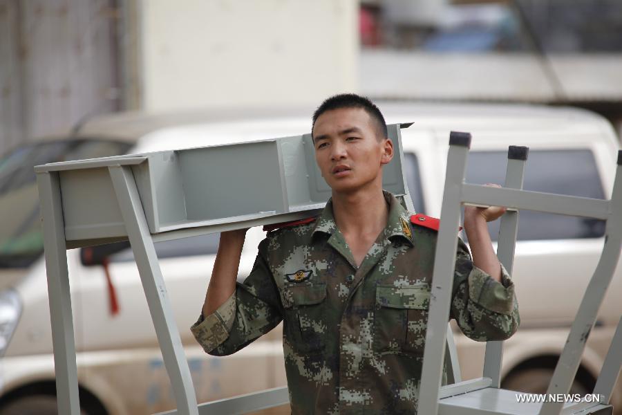 A soldier carries desks to a make-shift classroom at a hope school in the quake-hit Baogunao Township, Qiaojia County, south China's Yunnan Province, Aug. 25, 2014. Mobile classrooms have been set up at the hope school for students to start their new semester. (Xinhua/Zhang Guangyu)