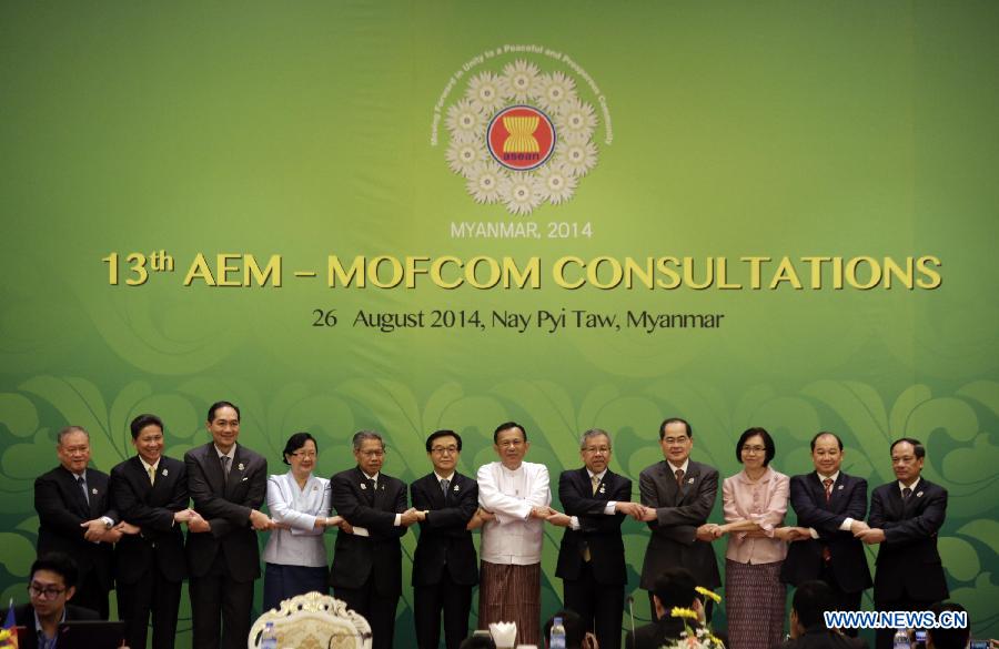 China's Commerce Minister Gao Hucheng (6th L) and ASEAN economic ministers pose for a photo during the China-ASEAN Economic Ministers Consultation in Nay Pyi Taw, Myanmar, on Aug. 26, 2014. (Xinhua/U Aung)