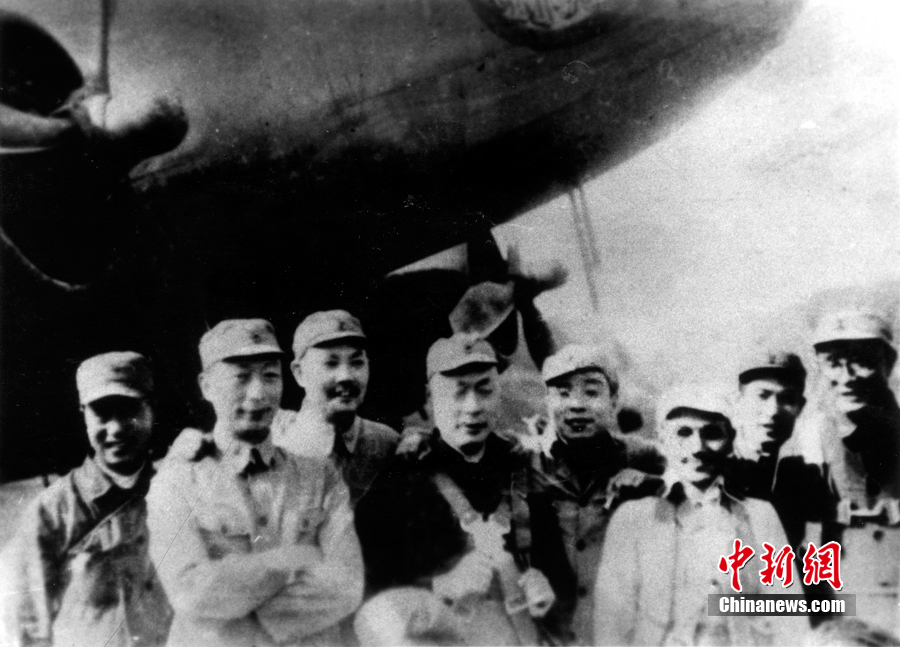 Nie Rongzhen, Yan Jianying, Chen Yi Deng Xiaoping (third from right) and other leaders pose for photo on Aug, 26, 1945. (Photo/CNS)