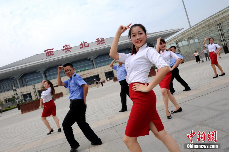 The stewards at Xi'an North Railway Station dance to "Little Apple" to welcome the passengers on Aug. 21, 2014, in Xi'an, northwest China's Shaanxi province. By the Chopsticks Brothers, "Little Apple" is one of the most popular songs in China. (Photo/CNS)
