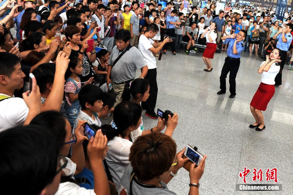 The stewards at Xi'an North Railway Station dance to "Little Apple" to welcome the passengers on Aug. 21, 2014, in Xi'an, northwest China's Shaanxi province. By the Chopsticks Brothers, "Little Apple" is one of the most popular songs in China. (Photo/CNS)